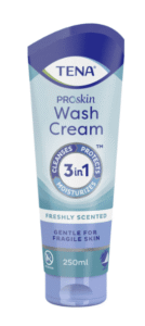 See õrn seebi ja vee alternatiiv puhastab, kaitseb ja niisutab habrast nahka. Mugav koostis, mida ei pea veega maha loputama. TENA ProSkin pesukreemi võib kasutada mähkmete vahetamisel intiimpiirkonnas või kogu keha puhastamiseks. Hooldav kreem on dermatoloogiliselt testitud, aitab säilitada naha loomulikku pH-taset ja on lõhnatu.